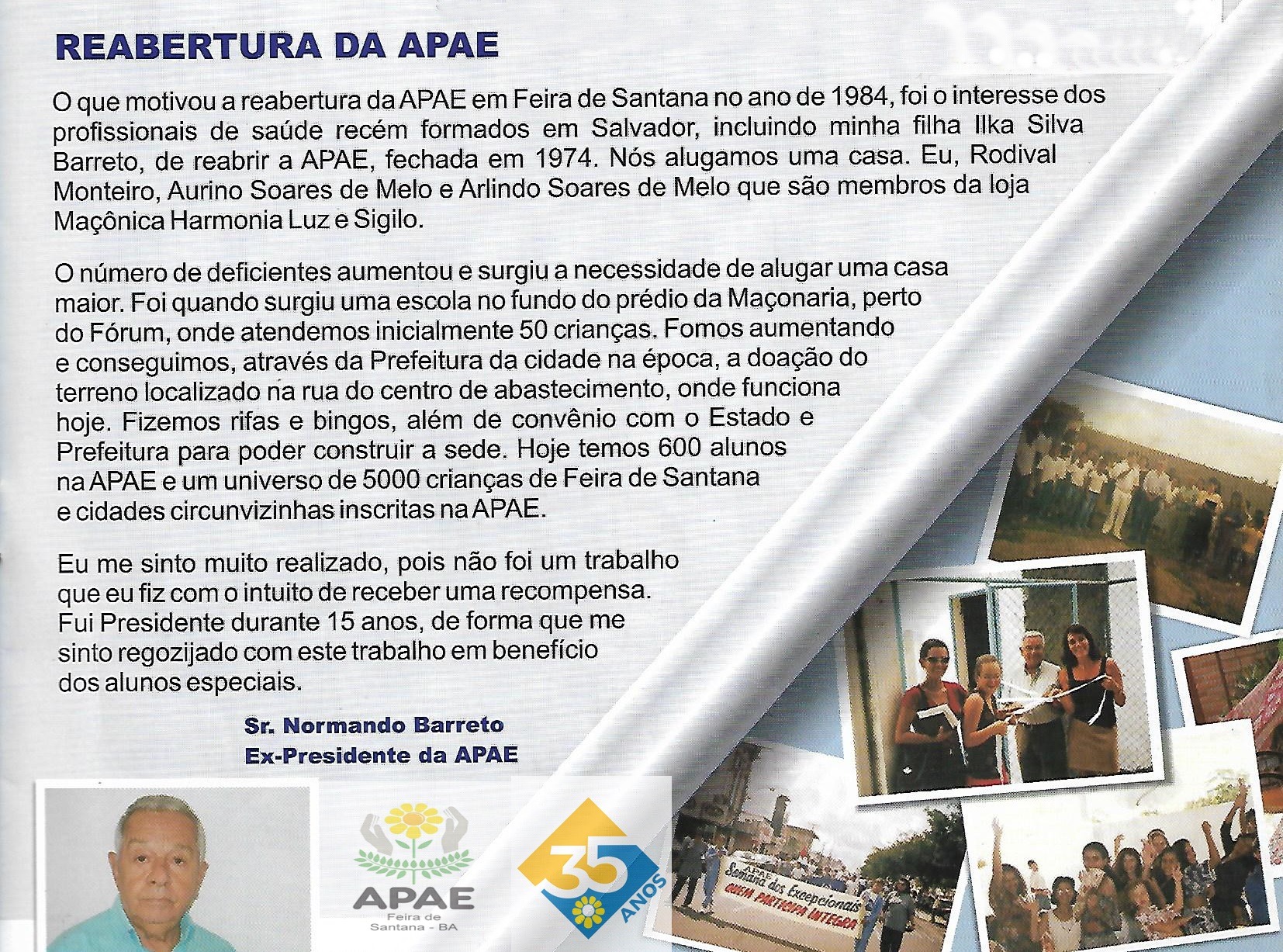 Conversei com meu pai, Normando Alves Barreto, sobre a proposta, pois, ele era uma dessas pessoas influentes e que conhecia muitas pessoas na cidade. Meu pai prontamente abraçou a ideia. Assim, fomos à busca desses parceiros, e juntamente com outros empresários e amigos, ligados a Loja Maçônica Harmonia Luz e Sigilo, formou-se a Diretoria Executiva da APAE.