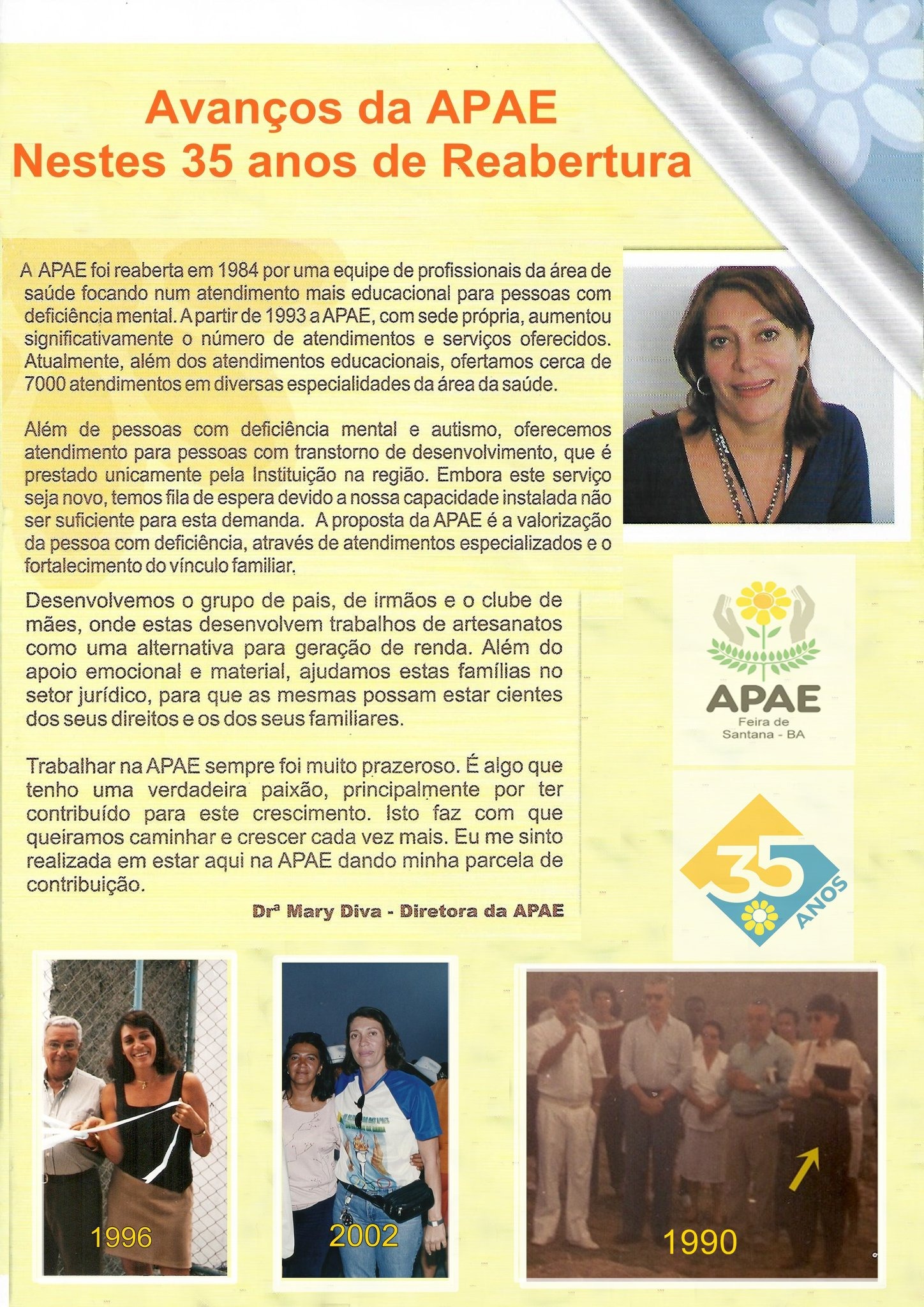 É importante falar nesse breve relato, sobre as pessoas que estiveram comigo durante esses anos. E graças a Deus foram muitas. As quais peço licença e perdão para não citar nomes e não ser injusta com nenhuma delas. Todas foram de vital importância na minha passagem pela APAE. Fomos parceiros. Fomos responsáveis pela ação e pelo resultado do outro. Sorrimos, brigamos, divergimos, sofremos, e comemoramos muitas vitórias. Ninguém atingiu nenhum sucesso na APAE sem a participação e o envolvimento do outro.