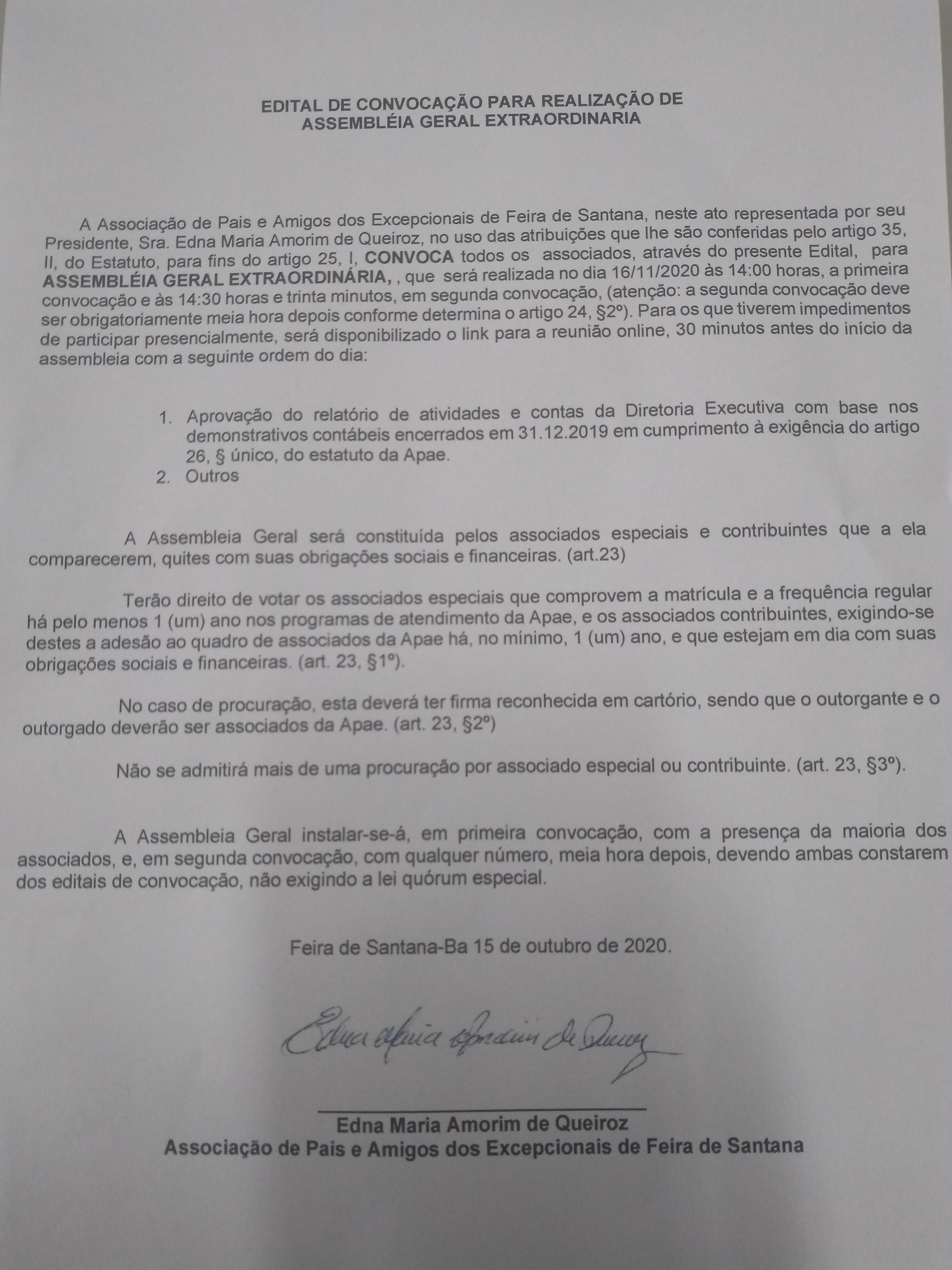 A Apae de Feira de Santana, localizada na Rua da APAE, Nº76, Centro, através de sua Diretoria Executiva, devidamente representada pela sua Presidente Sra. Edna Maria Amorim de Queiroz, CONVOCA através do presente edital, todos os membros da Diretoria Executiva da APAE, para Assembleia Geral Extraordinária, que será realizada no dia 16 de novembro do ano em curso, na sede da Apae, em primeira convocação às 14:00 horas, e em segunda convocação às 14:30 horas,com a seguinte ordem do dia: